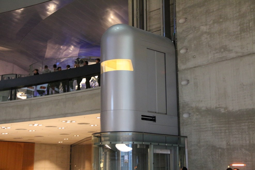 Посетителей сажают в лифт вот такой космической формы и отвозят на верхний этаж: