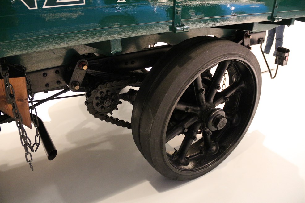 Передача крутящего момента на колесо на первых грузовиках осуществлялась не посредством вала, а c помощью толстой цепи: