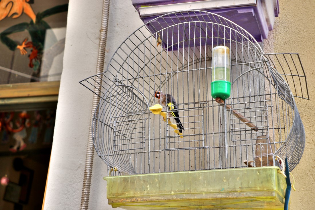 Клетка птицы стоит прямо на улице: