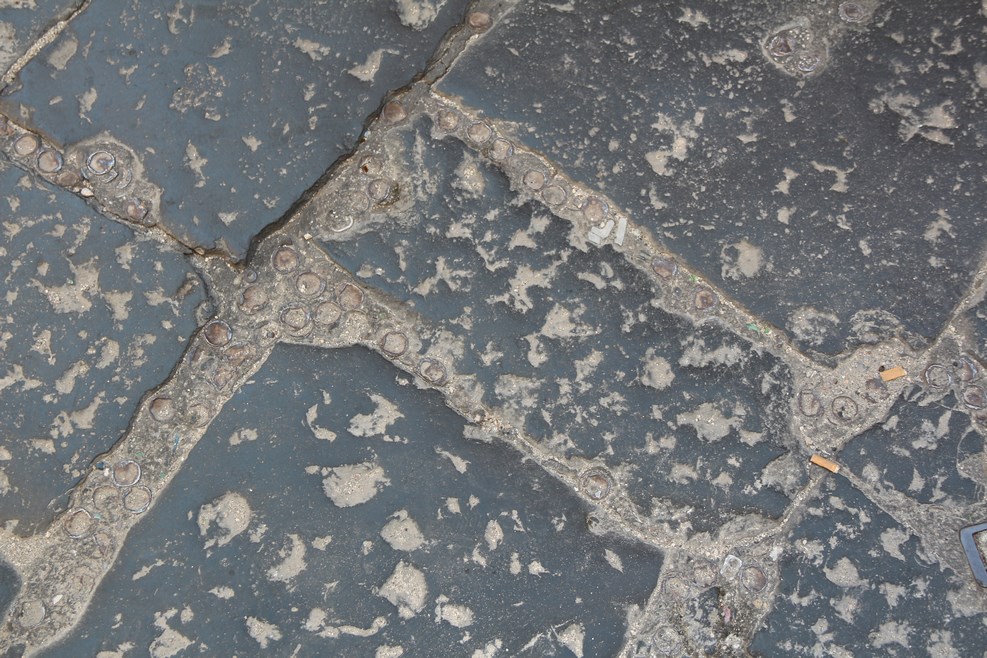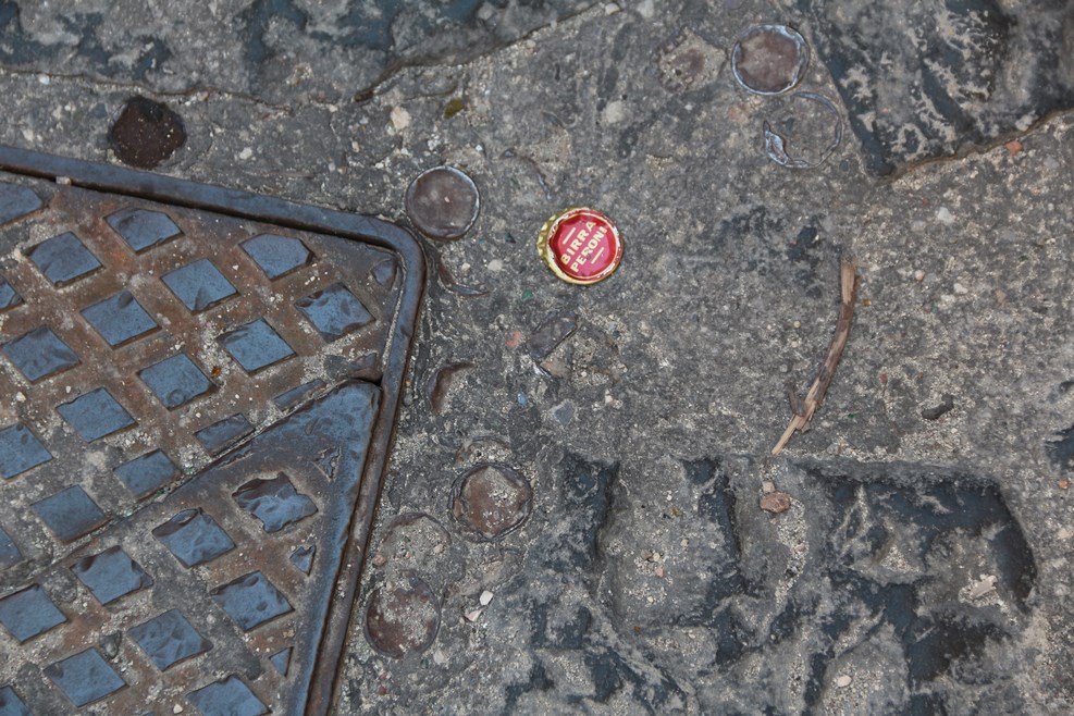 В центре, в старую плитку почему-то вмято множество бутылочных крышек: