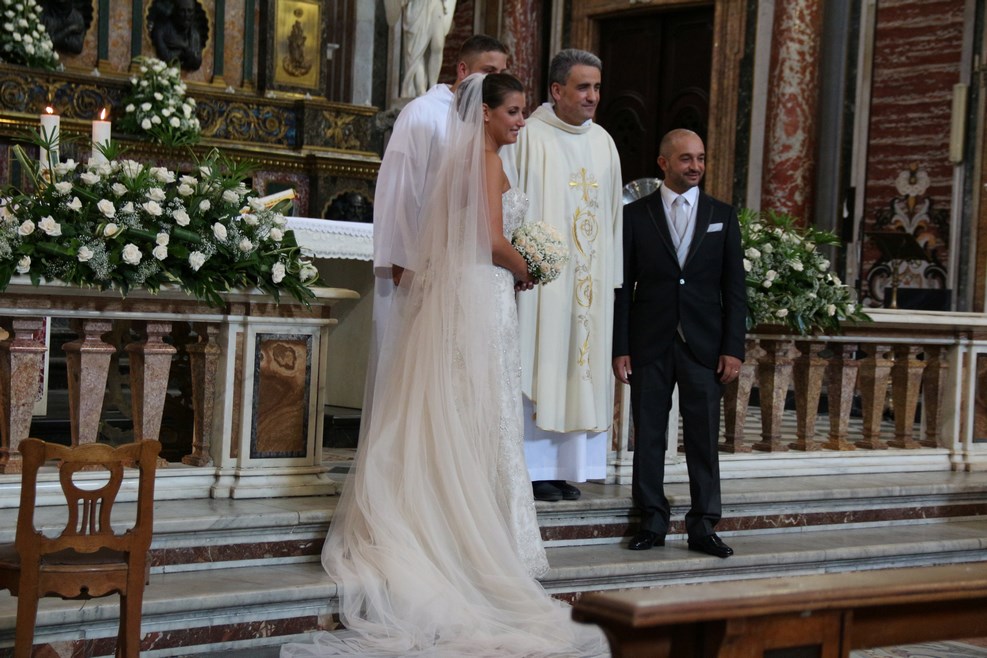В местном храме играли свадьбу. После обряда венчания жених и невеста сфотографировались со священнослужителями, которые их венчали: