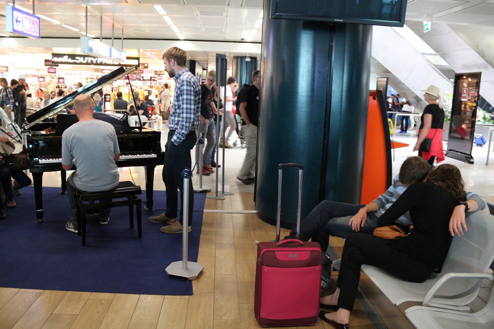 Обратно мы летели, так же как и прилетели, через Вену. В римском аэропорту Фьюмичино в зале ожидания стояло фортепиано. Любой желающий мог на нем поиграть. Так как мы летели в Вену, одну из культурных столиц Европы, то желающих виртуозов собралось чуть больше чем много. Парочка справа так и уснула под расслабляющие мелодии: