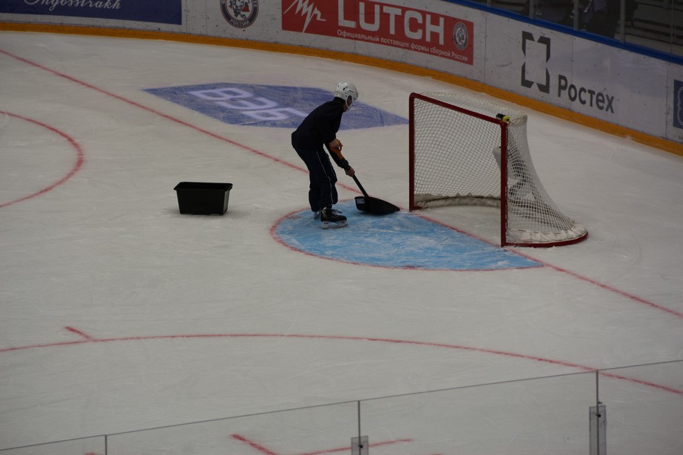 В паузах игры к воротам выезжал чувак с лопатой и подчищал там скопившийся снег и лед: