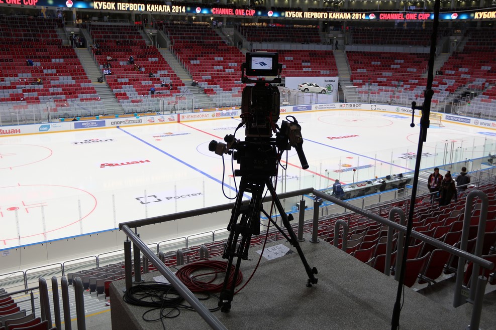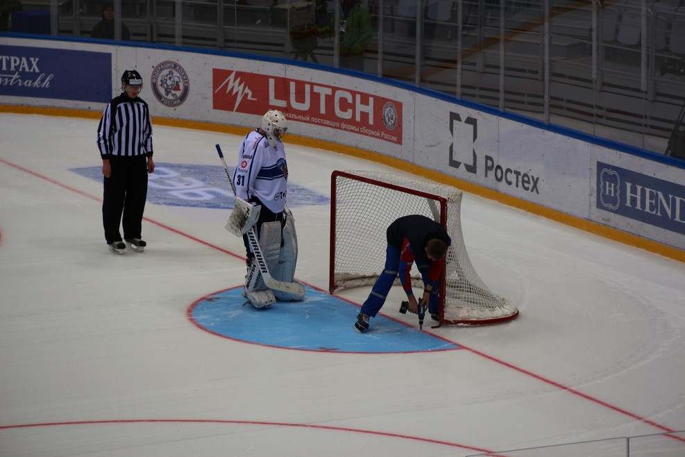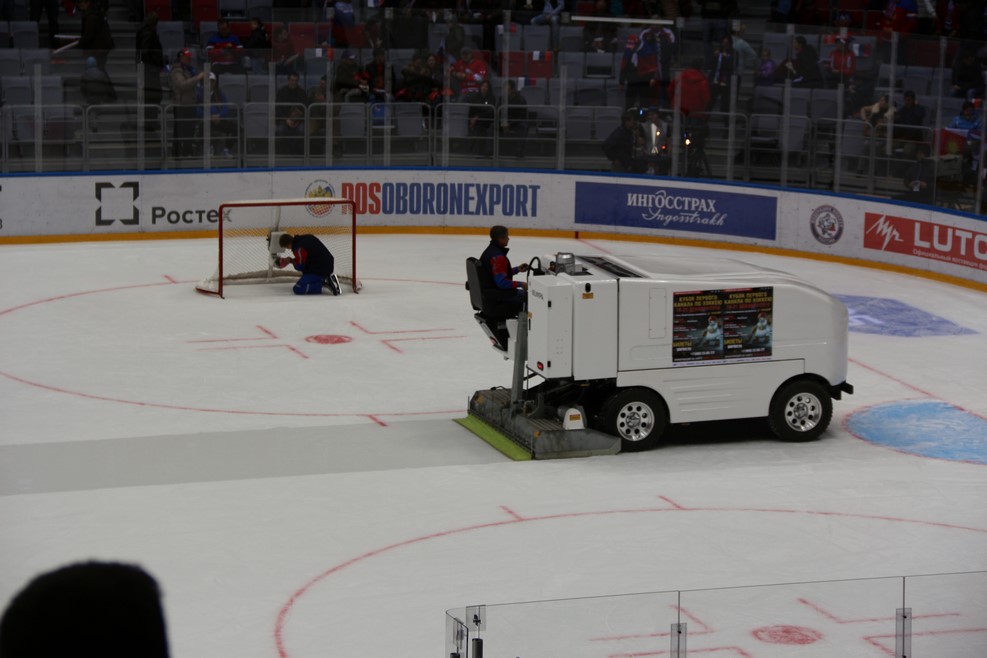 Перерыв между таймами. Лед заливают, а технический специалист поправляет камеру в воротах: