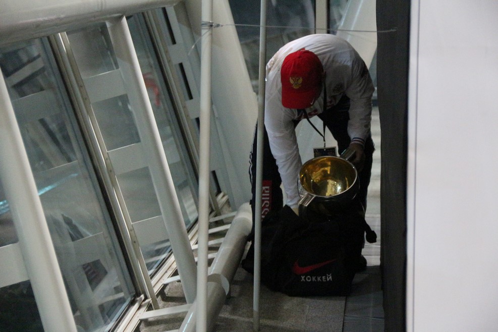 Каждый желающий мог сфотографироваться с кубком России по хоккею. Потом кубок убрали в сумку и унесли:
