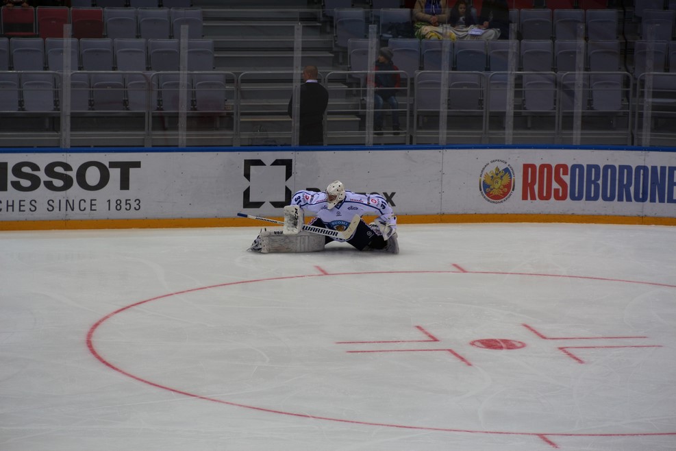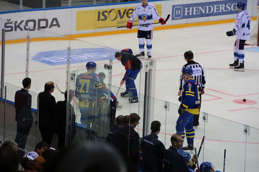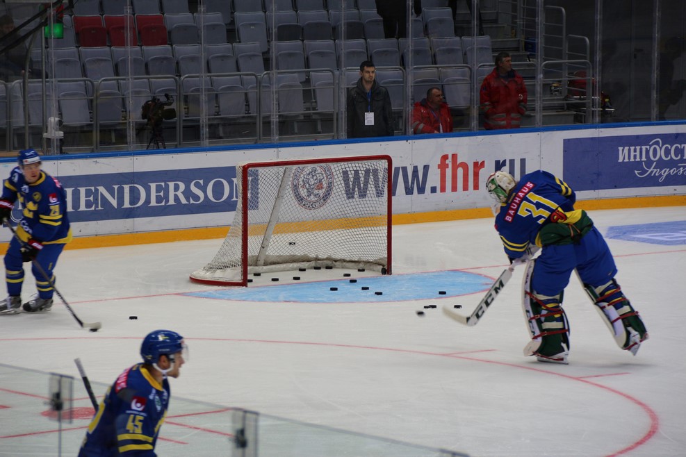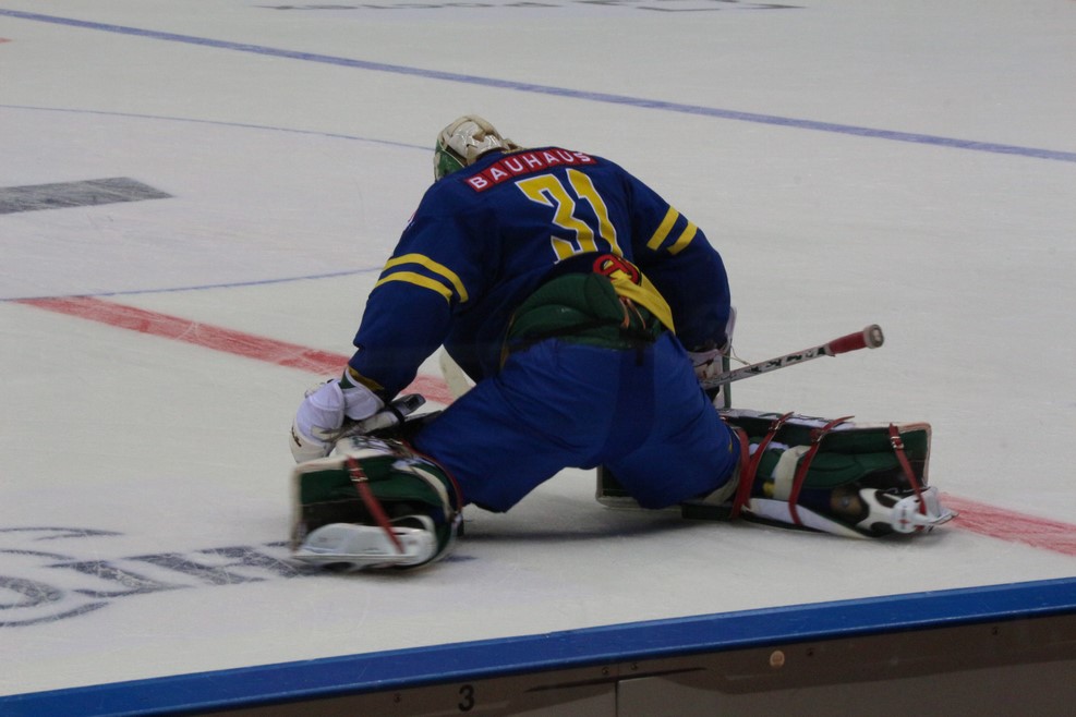 Началась подготовка ко второму тайму между сборными Швеции и Финляндии. Вратарь со всем остервенением забивал шайбы в свои ворота: