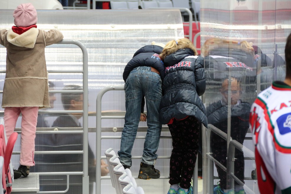 Основной состав выходит на лед. Девочки просили у выходивших хоккеистов автограф: