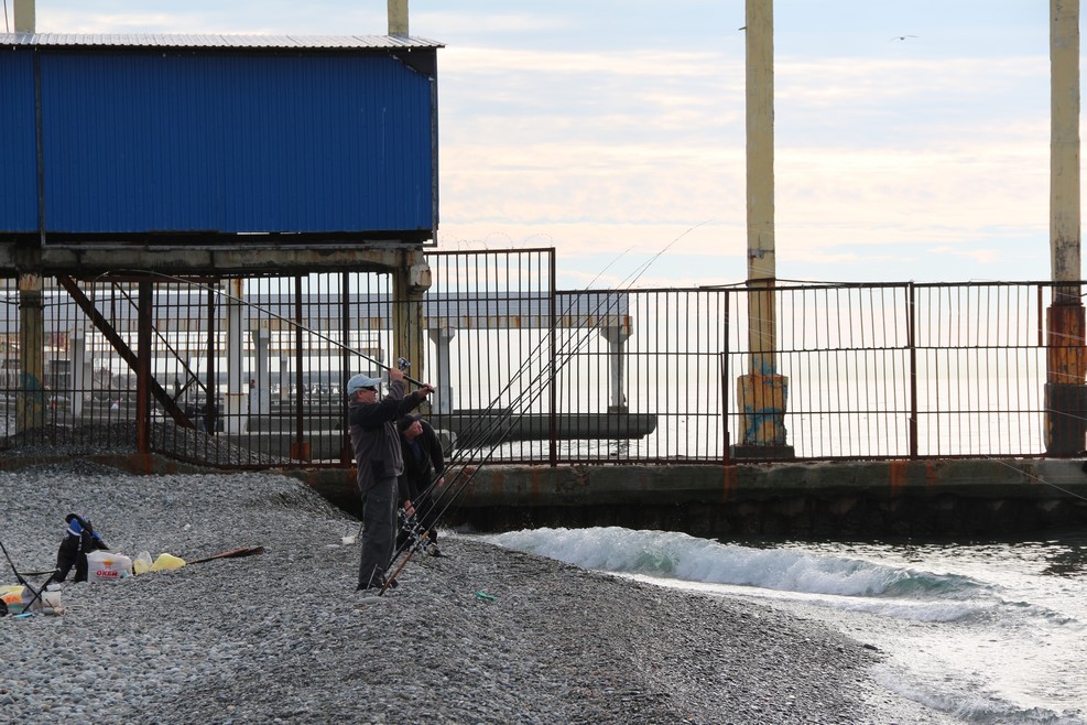Температура воды +15, но некоторые местные аборигены в хорошую погоду все равно купаются. Рядом неторопливо рыбачат рыбаки: