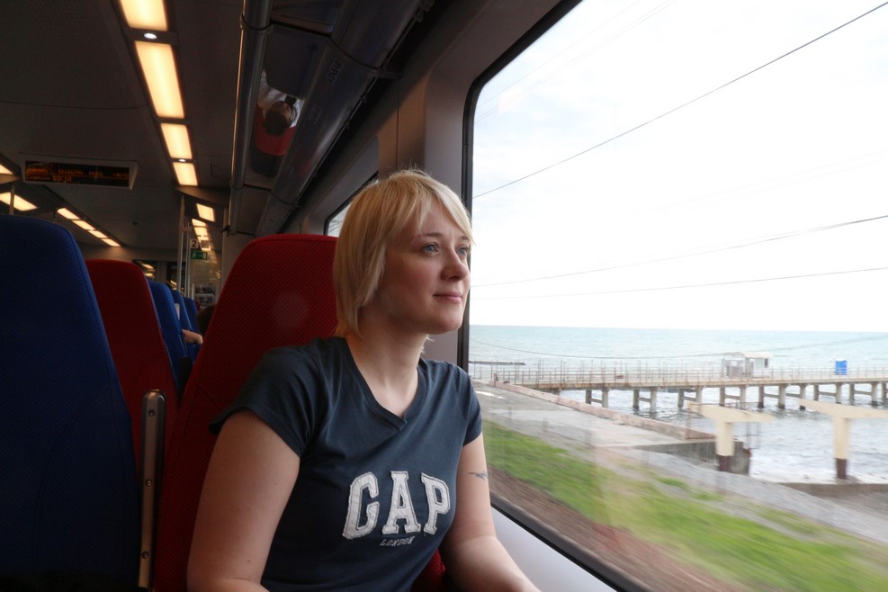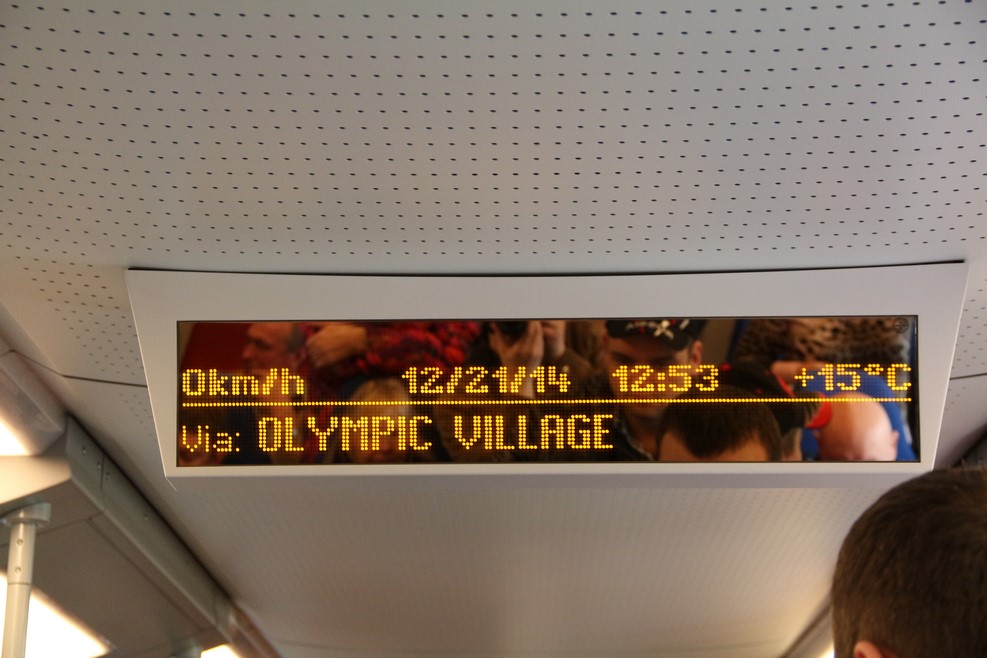 В Сочи, Красную Поляну и Олимпийский парк мы передвигались на новых немецких поездах «Ласточка». Табло внутри:
