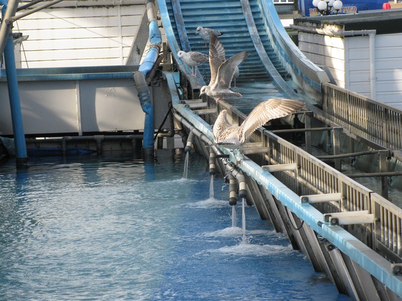 Чайки в городе размером чуть меньше крокодила, эти купались в воде детского аттракциона: