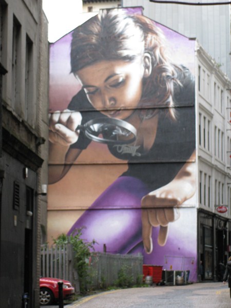 Любопытная находка художника, фреска на стене в виде тетки, которая через лупу рассматривает помойку (мусорный ящик реальный):