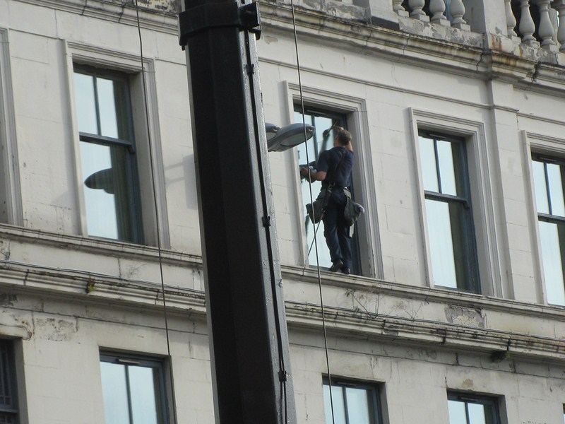 Дядька моет окно на большой высоте, стоя около пропасти: