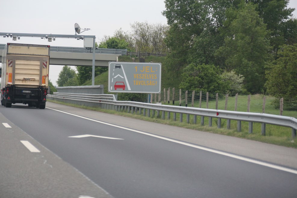 Венгерские дороги очень качественные, с большим количеством указателей и грамотной разметкой. Вот, к примеру, на знаке указано, что дистанция между автомобилями должна быть одна стрелка: