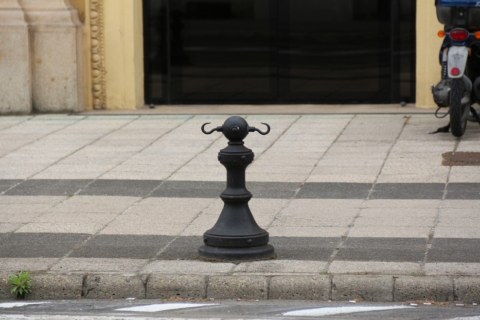 Столб от ограды. На его «усы» по идее должна быть надета цепь: