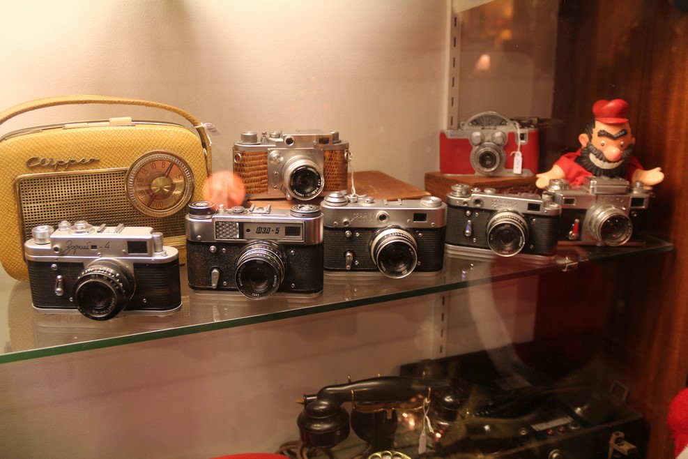 Среди многих магазинчиков выделяются магазины, которые продают старые вещи. Вот, к примеру, продаются старые фотоаппараты советского производства: