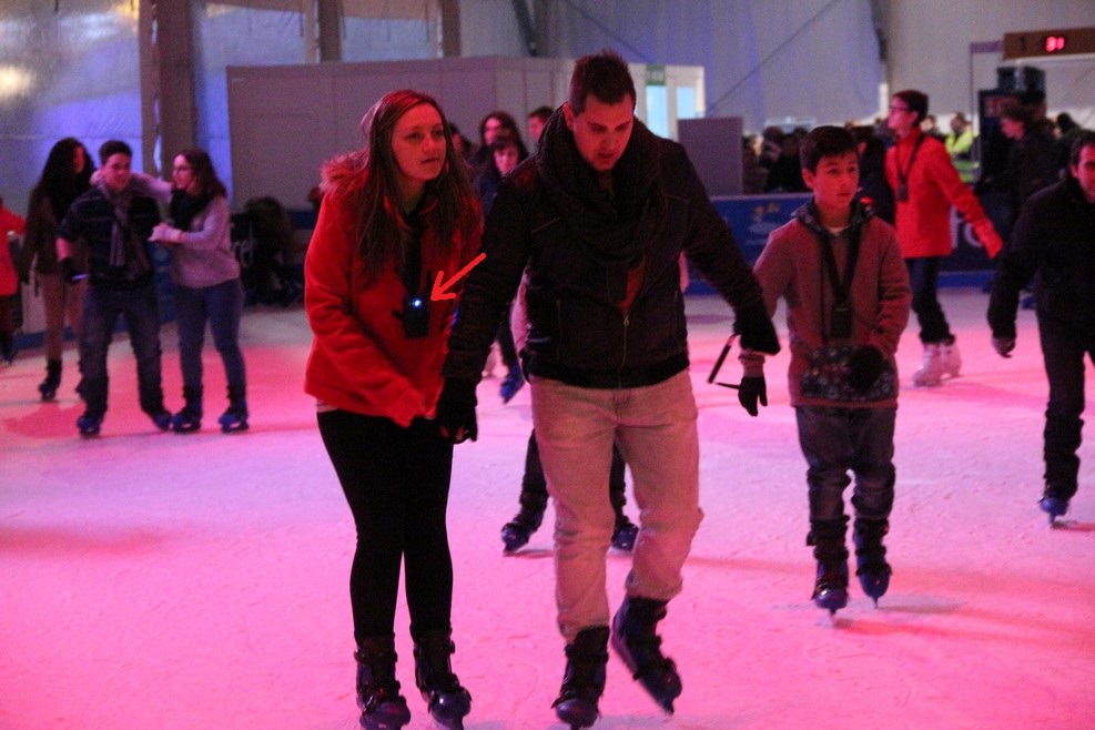 Несмотря на то, что температура в это время года поднимается до +20, в самом центре города есть каток!. Люди на нем ездят с прибором, который мигает синим огоньком (отмечено красной стрелкой). Всего вероятней этой какой-то счетчик времени нахождения на катке:
