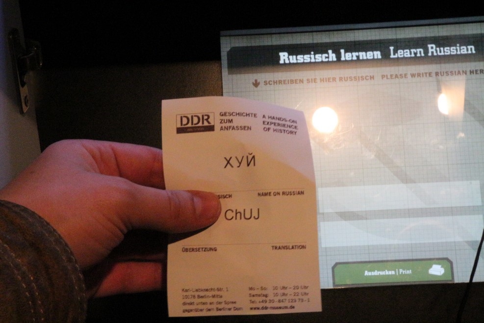 ГДРовцы учили русский язык. В качестве иллюстрации к этому в музее установлен компьютер, на котором можно набрать свое имя на латинице, а он тебе выдаст на чеке имя в русской транскрипции на кириллице. Вот передо мной какой-то китаец набрал свое имя: