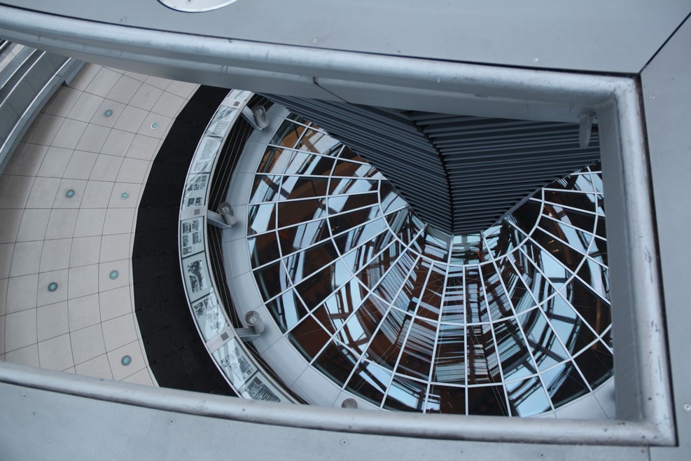 На крыше установлена система зеркал, что бы усиливать свет внутри здания. Этим достигается экономия электричества: