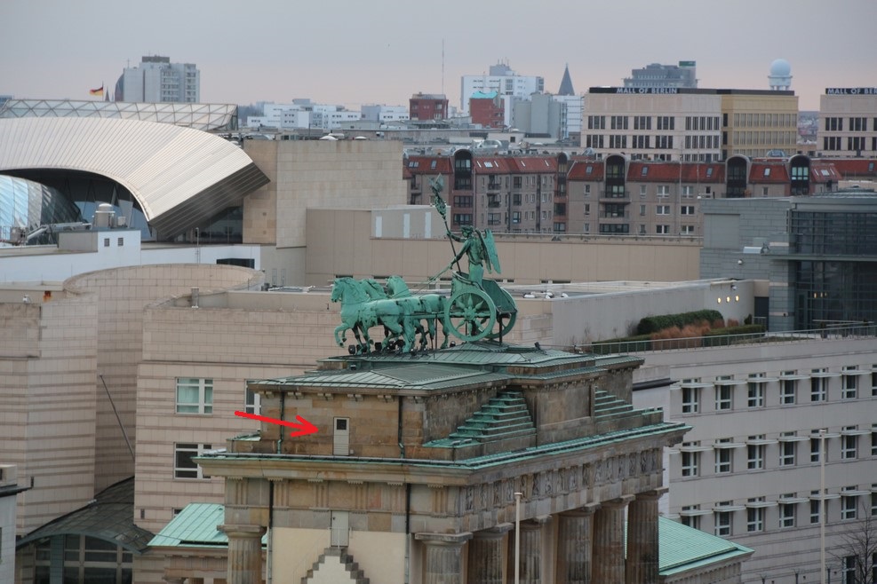На Бранденбургских воротах я обнаружил потайную дверь (щелкните по фото, чтобы рассмотреть поближе):