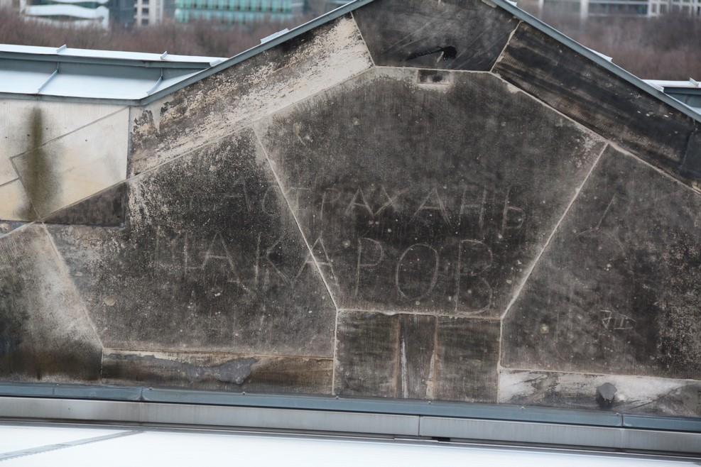 Попав внутрь здания, на лифте поднялись на крышу. Там осталась единственная на всем фасаде после реставрации надпись от нашего неизвестного воина «Астрахань Макаров»: