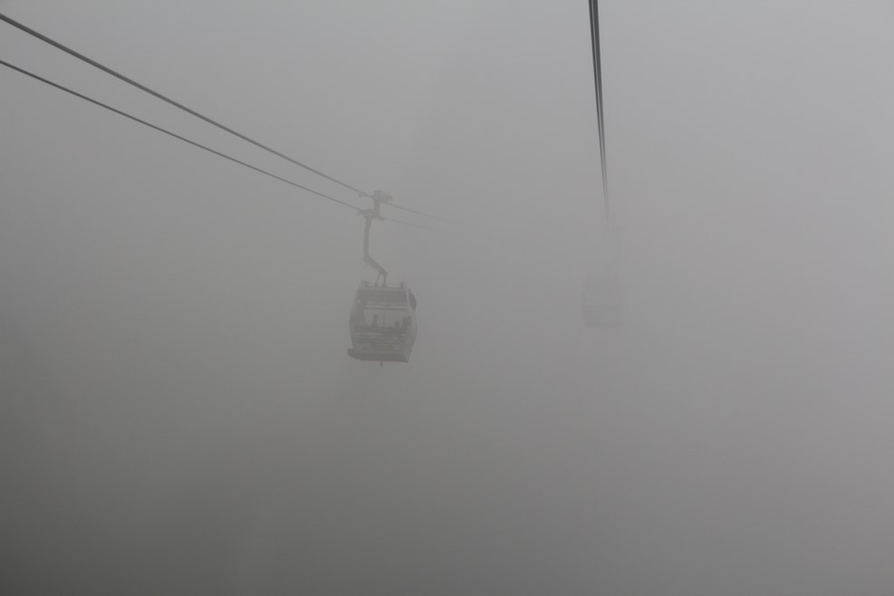 Время движения канатной дороги до центра острова 30 минут. На посадке европеец уговаривает китайца поехать в открытой кабинке, но китаец отказывается: