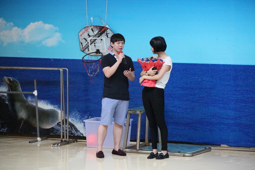 Дальше уж очень все стало похоже на постановку. На сцену вызвали девушку и парня. Им завязали глаза под предлогом очередного трюка с тюленем, но парень повязку сразу снял и ему дали в руки букет цветов. Потом ведущая попросила снять повязку и девушку, и парень ей сделал предложение:
