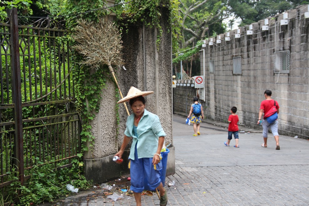 Уборщица территории с веником необычной формы: