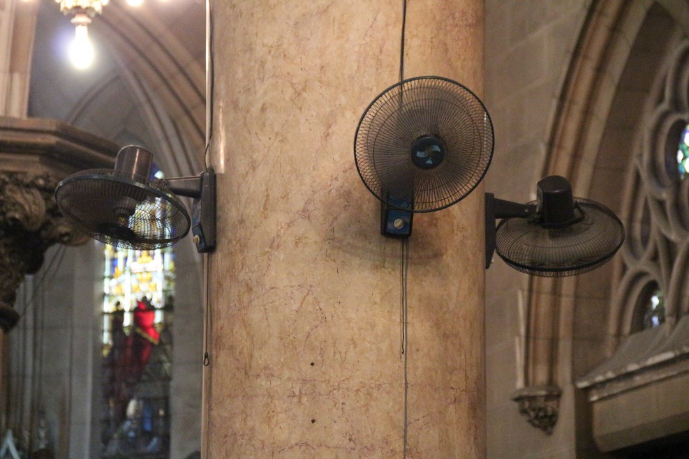 В местном храме, где идет служба, используют для охлаждения вентиляторы, прикрепленные прямо к колоне. Вентиляторы кстати очень спасали нас во время поездки от жары: