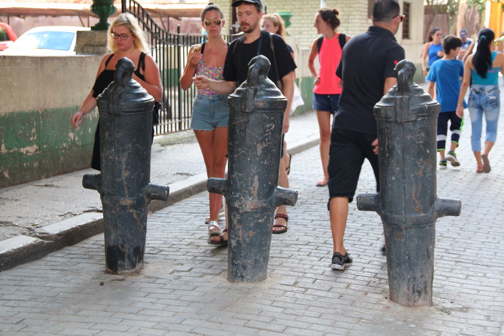 Дошли до пешеходных улиц. Все пешеходные зоны в центре города защищены вкопанными старыми пушками: