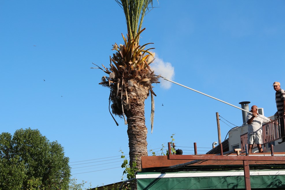 Дядька зачем-то сбивал мешочки с семенами с пальмы: