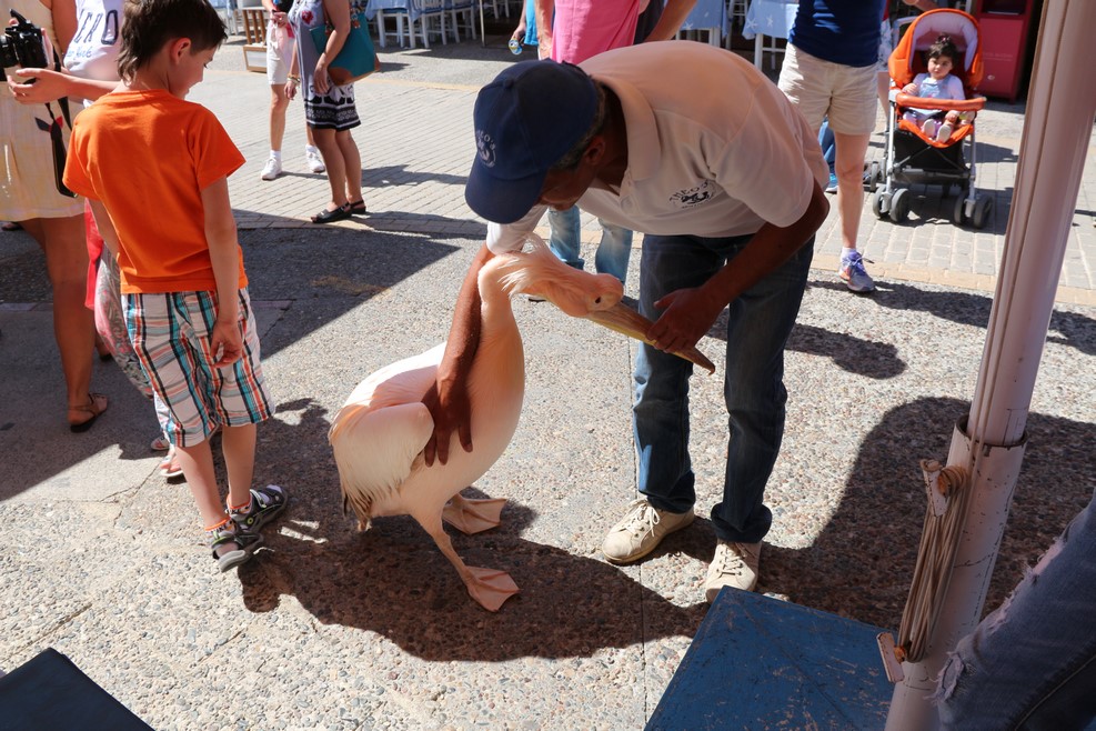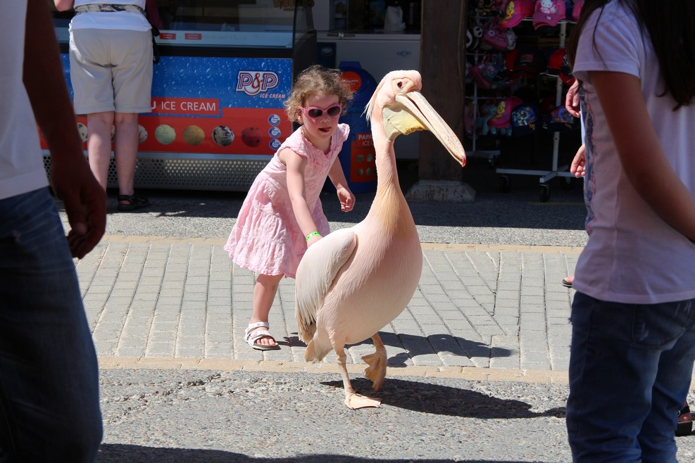 На набережную к одной из кафешек прилетает пеликан: