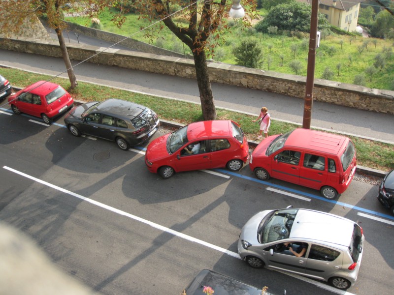 Погуляли по городу. Около крепостной стены какая то тетка пыталась запарковать свой автомобильчик. Ткнувшись пару раз в бампер сзади стоящей машины не солоно хлебавши она поехала искать парковку в другом месте: