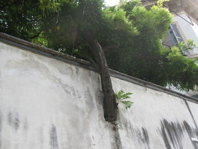 Дерево уперлось в стенку и вместо того что бы обрубить ветку, сделали в ней дырку: