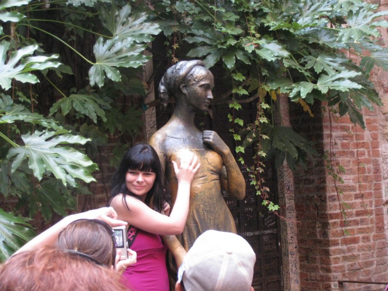 Во дворе стоит изваяние самой Джульетты и все туристы считают своим долгом потрогать ее за сиськи:
