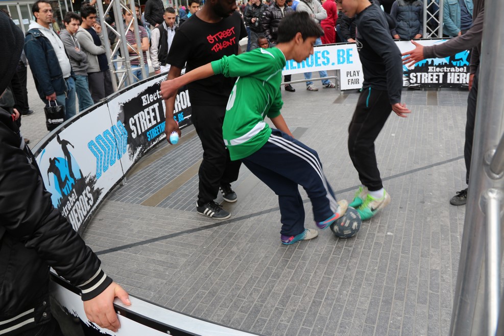 Ребята играют в футбол двое надвое на круглой площадке. Гол надо забить в ворота, которые видны между играющими: