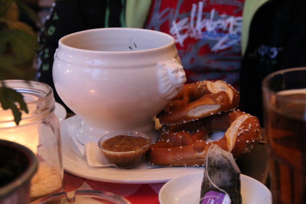 Вечером пили пиво с сосисками и крендельками. Сосиски давали вот в таком горшочке: