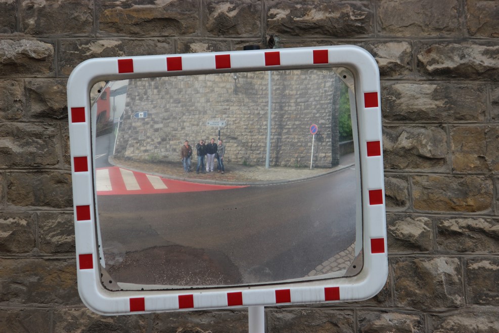 На перекрестках стоят вот такие отражающие зеркала, что бы видеть движущиеся помехи. В отражении наша четверка:
