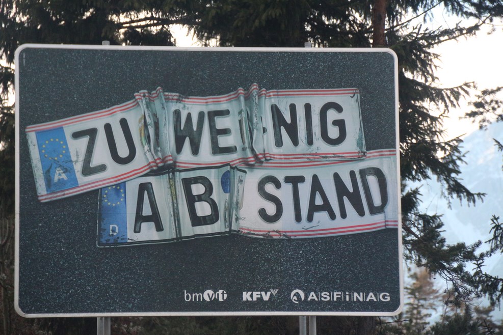 Вдоль австрийских автобанов выставлены билборды с надписью «сохраняй дистанцию» на немецком и английских языке: