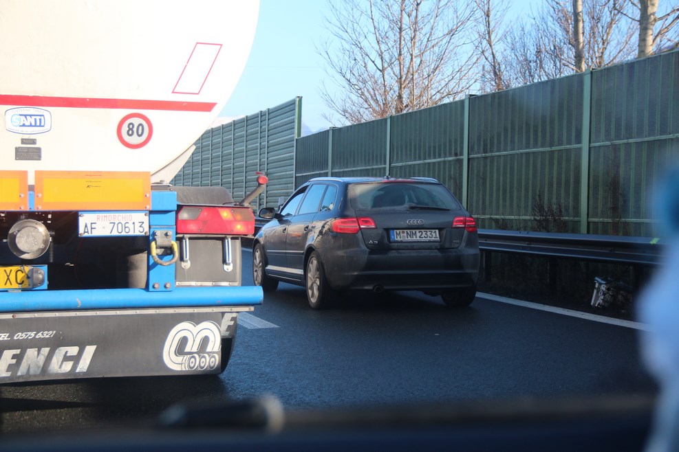 Что бы попасть из Вены в Инсбрук, надо проехать примерно 100 километров по Германии. На границе была глухая пробка, вызванная дополнительным контролем немецких пограничников. Знак в нейтральной зоне предупреждает, что не стоит перелазить через ограждение, разделяющие потоки автобана: