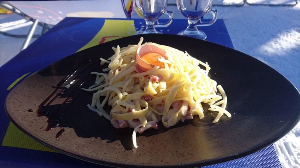 На склоне, кстати, можно вполне себе неплохо питаться. Стоимость обеда составляет примерно 14-16 евро: