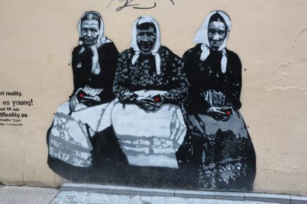 Уличная выставка гобеленов. Посередине без труда узнается картина Густава Климта: