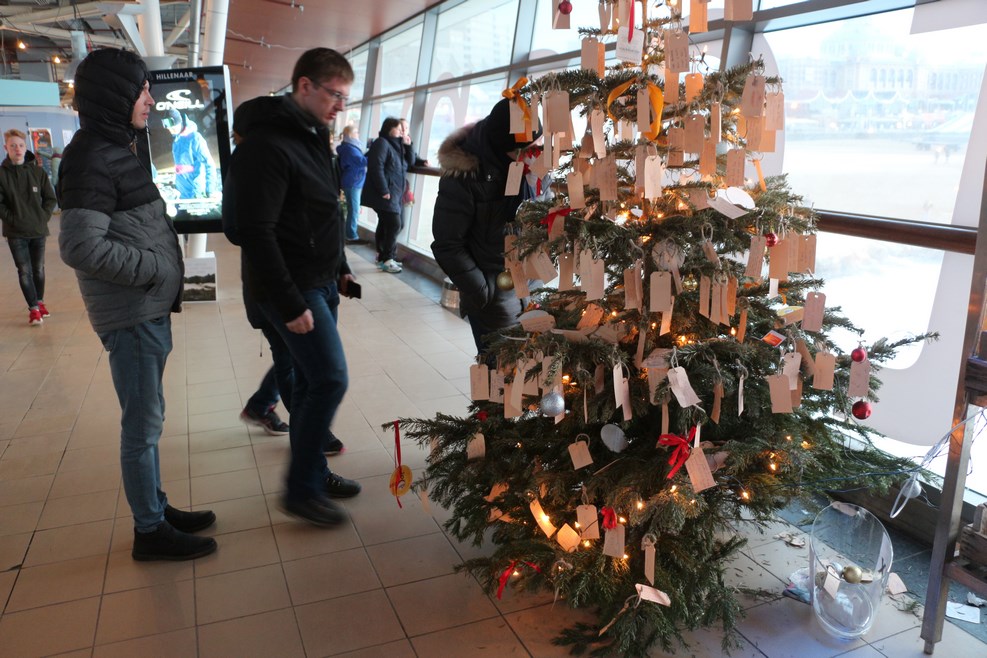 Новогодняя елка с пожеланиями на следующий год, которые написаны на подвешенных бумажках: