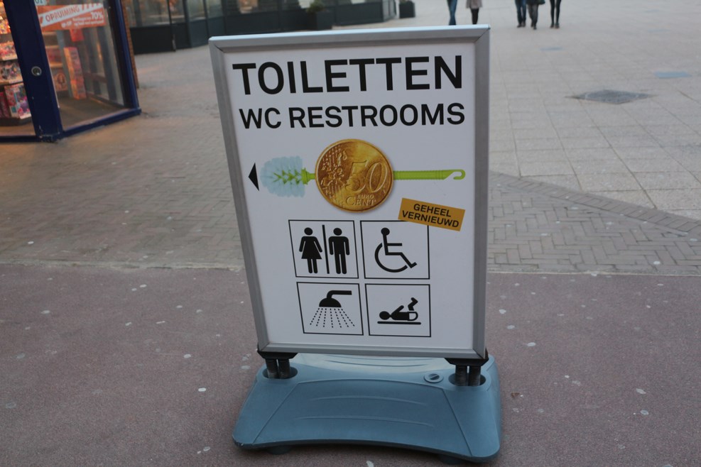 С пирса мы пошли покушать. Указатель на общественный туалет: