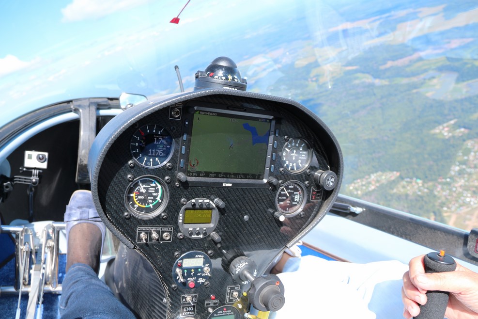 И полетели. Красная верёвочка на стекле прикреплена не для красоты. Она показывает угол наклона планера в пространстве: