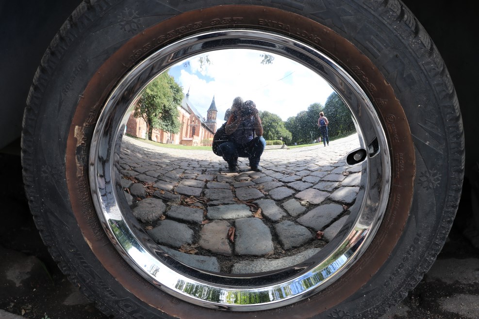 Я с Олькой в отражении хромированной накладки на диск колеса: