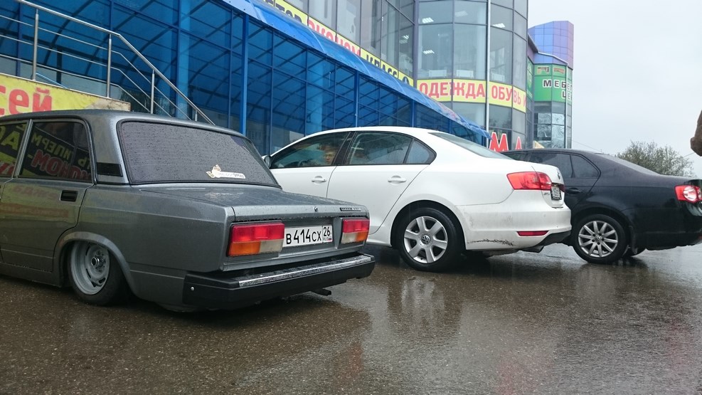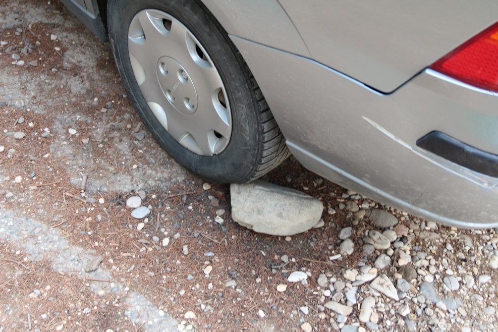 Поднимаемся на крутой подъем. Хозяин этой машины подложил камень под колесо, чтобы машина не укатилась:
