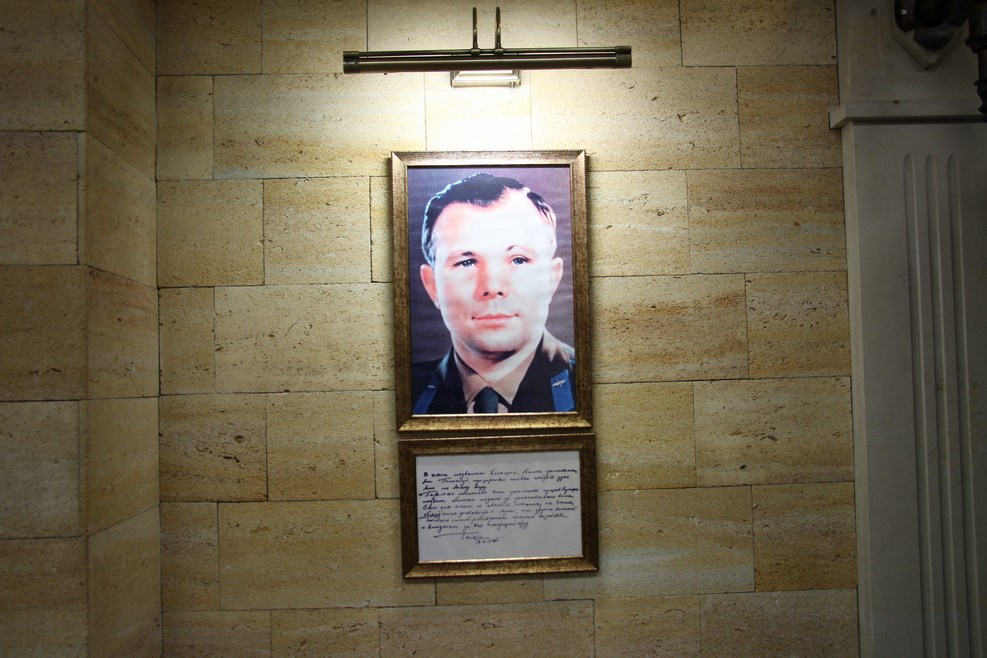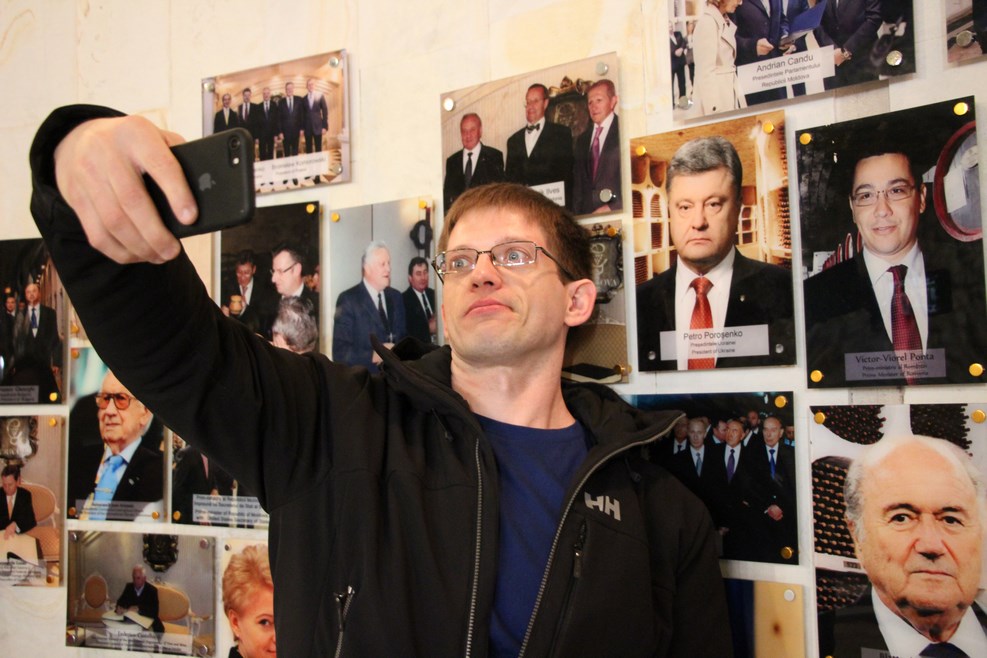 Лешка фотографируется на фоне известных людей, которые посетили музей: