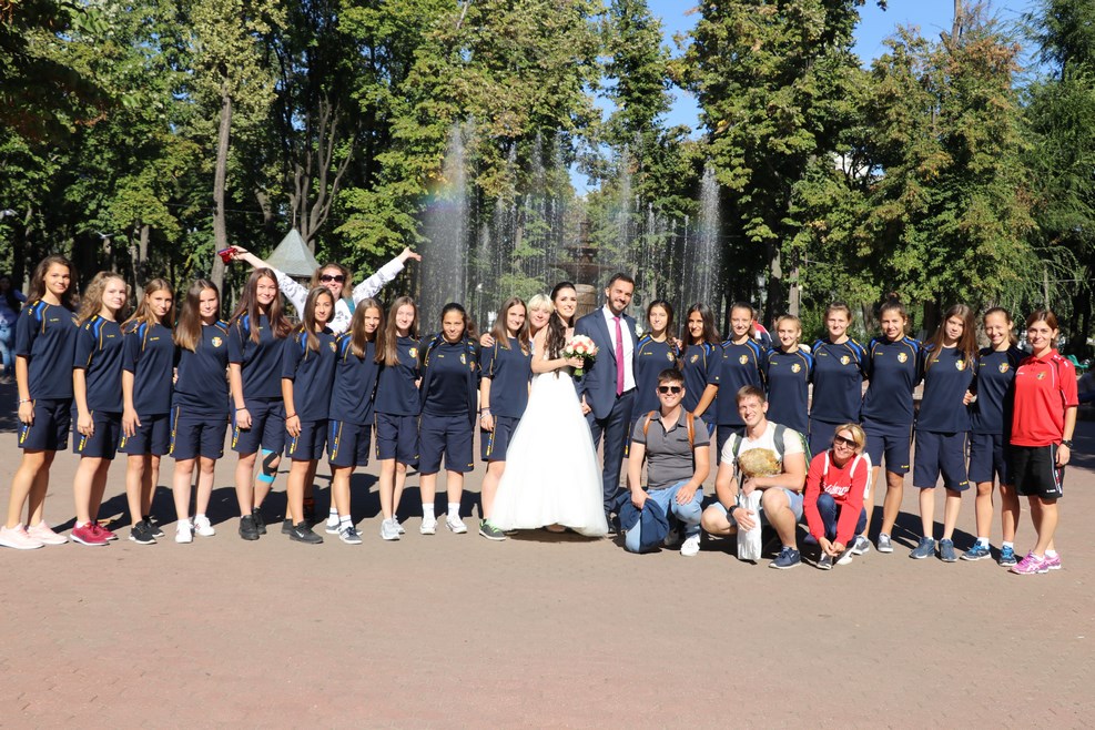 Поймали спортивную женскую команду (по футболу?) и молодоженов: