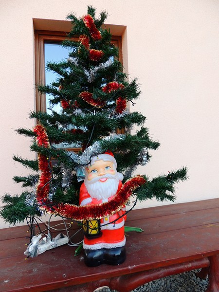 Вышли на прогулку. На улице под ёлкой нас встречает Санта: