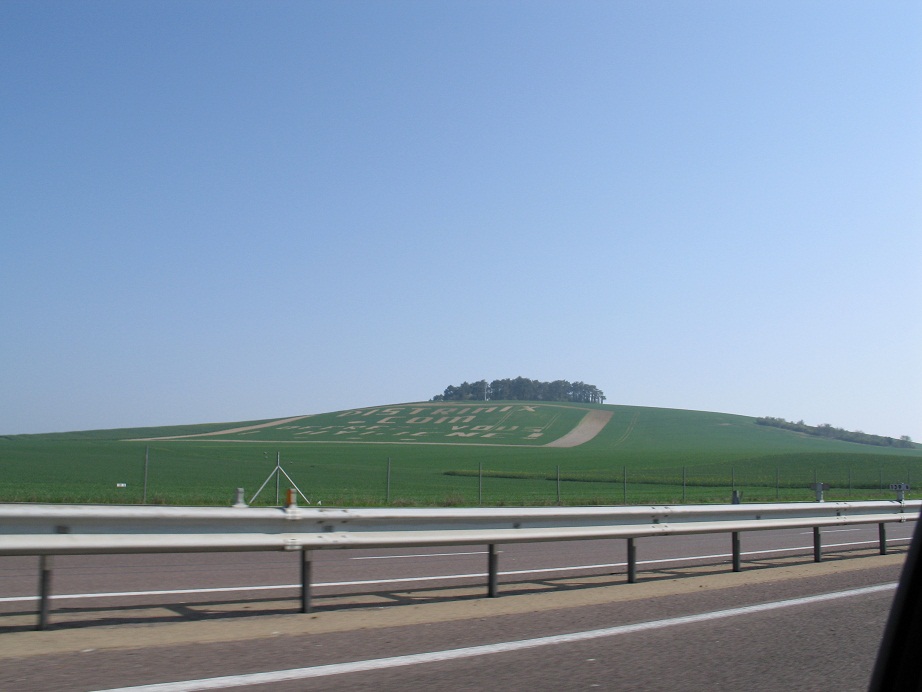 Утром выдвинулись из Парижа. Наш маршрут пролегал по живописным местам на юг. По пути попалась вот такая реклама прямо на поле: